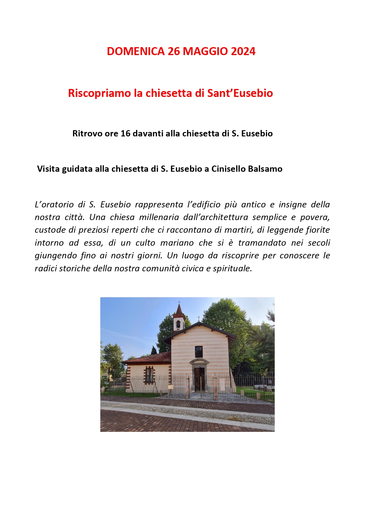 Domenica 26 Maggio – Visita guidata alla Chiesetta di S.Eusebio Visualizzazioni: 411 Condividi questo contenuto